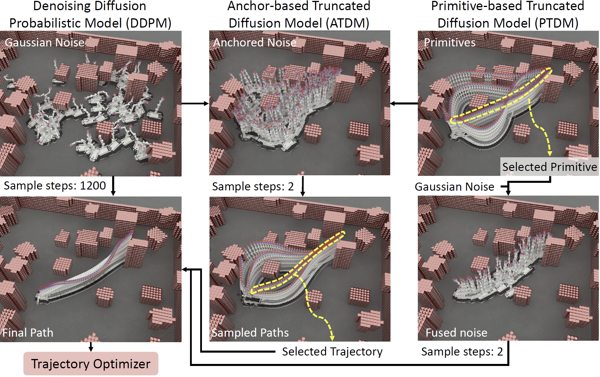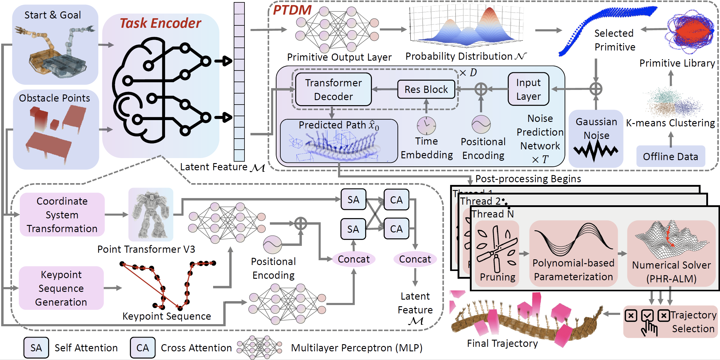 We present a learning-enhanced motion planner for differential drive mobile manipulators to improve efficiency, success rate, and optimality. For task representation encoder, we propose a keypoint sequence extraction module that maps boundary states to 3D space via differentiable forward kinematics. Point clouds and keypoints are encoded separately and fused with attention, enabling effective integration of environment and boundary states information. We also propose a primitive-based truncated diffusion model that samples from a biased distribution. Compared with vanilla diffusion model, this framework improves the efficiency and diversity of the solution. Denoised paths are refined by trajectory optimization to ensure dynamic feasibility and task-specific optimality. In cluttered 3D simulations, our method achieves higher success rate, improved trajectory diversity, and competitive runtime compared to vanilla diffusion and classical baselines.